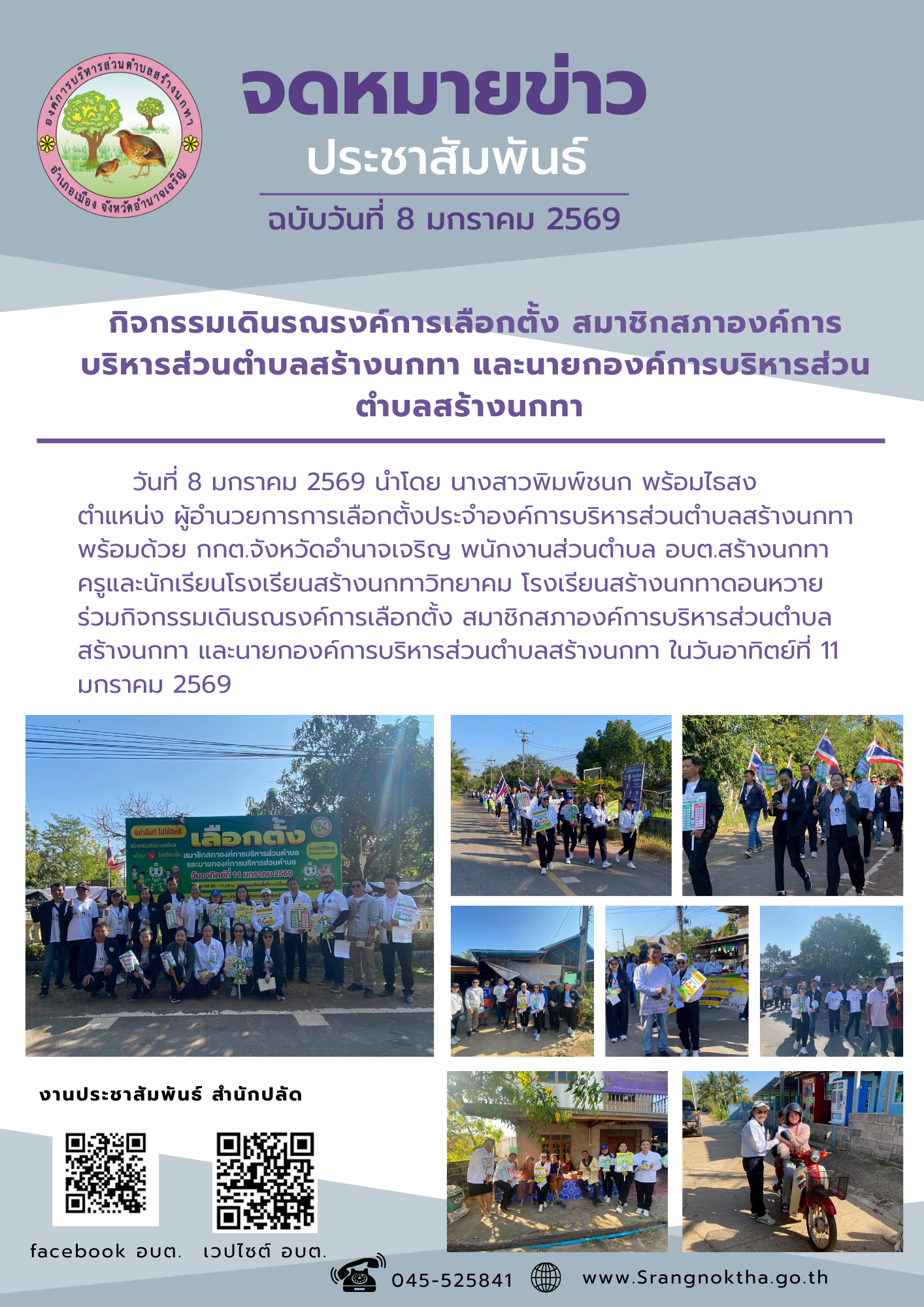 กิจกรรมเดินรณรงค์การเลือกตั้ง สมาชิกสภาองค์การบริหารส่วนตำบลสร้างนกทา และนายกองค์การบริหารส่วนตำบลสร้างนกทา ในวันอาทิตย์ที่ 11 มกราคม 2569[8 มกราคม 2569]
